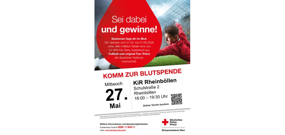 Komm zur Blutspende am 27.05.2026 und gewinne eins von 50 WM-Fan-Sets. Die Verlosung findet vom 01.05. bis 07.06.2026 statt.