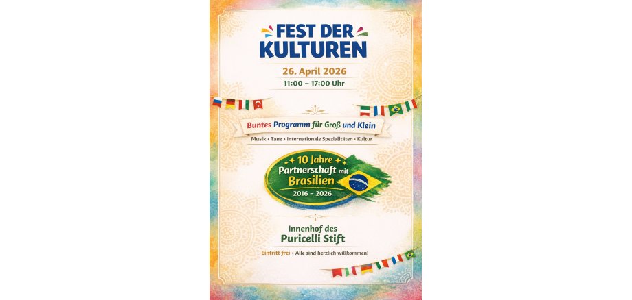 Das FEST DER KULTUREN findet am 26.04.2026 von 11 - 17.00 Uhr im Innenhof des Puricelli Stift in Rheinböllen statt. Es erwartet Sie ein buntes Programm für Groß und Klein. Geboten werden Ihnen kulinarische, musikalische und kulturelle Highlights aus vielen verschiedenen Ländern. Ganz besonders stolz sind wir auf die 10jährige Partnerschaft mit der brasilianischen Stadt Maratá.